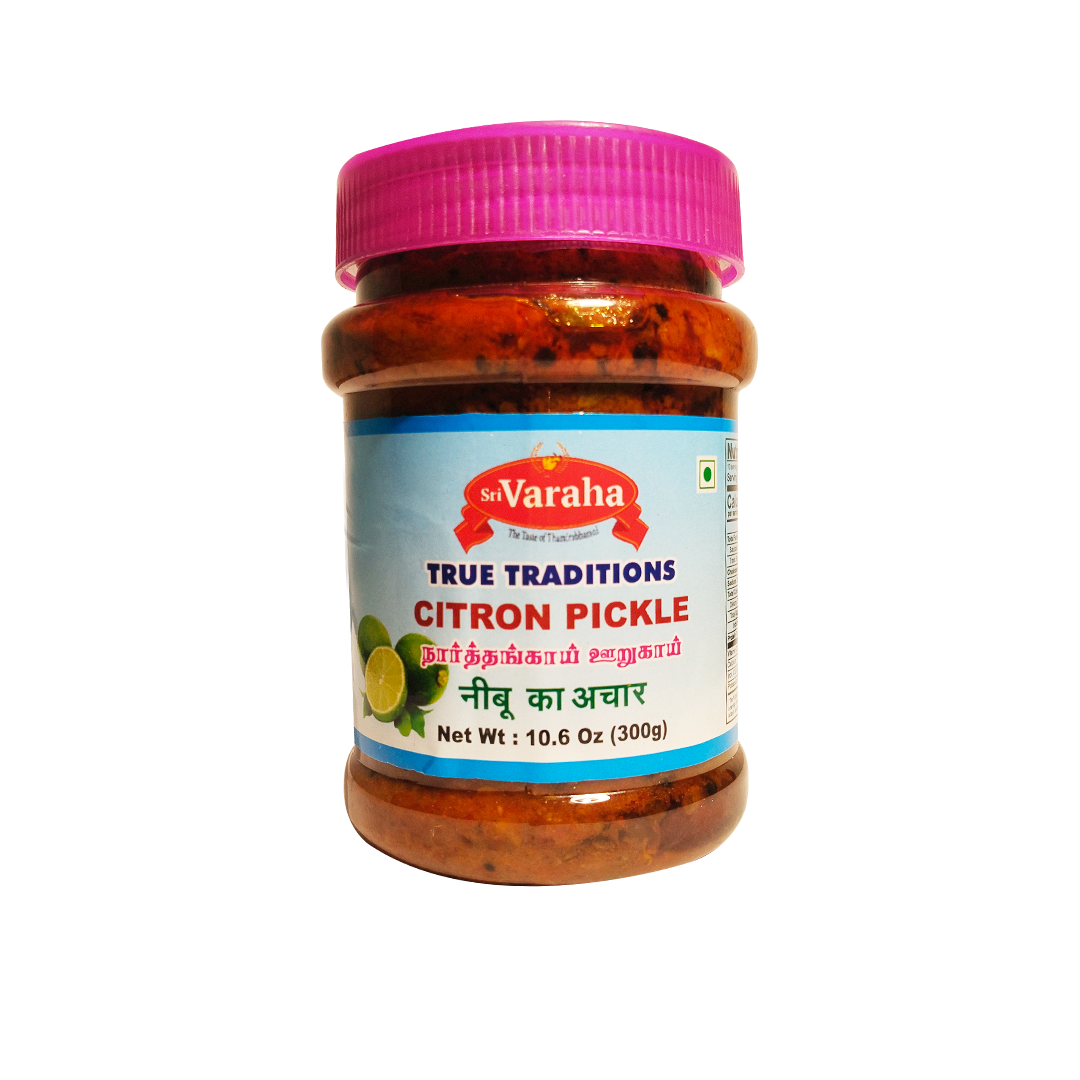 Experience the zesty tang and numerous health benefits of True Traditions-Sri Varaha Foods' Citron Narthangai pickle, infused with the authentic taste of Thamirabarani. Made with care and expertise, this flavorful delight offers a burst of South Indian tradition in every bite. Rich in vitamin C and antioxidants, our Citron Narthangai pickle not only tantalizes your taste buds but also boosts your immune system and promotes digestion. Whether paired with rice, dosa, or enjoyed straight from the jar, this pickle is a versatile addition to any meal. Indulge guilt-free as our pickle is crafted without any artificial additives, ensuring purity and authenticity with every spoonful. Elevate your dining experience and savor the goodness of Thamirabarani with True Traditions-Sri Varaha Foods' Citron Narthangai pickle today!