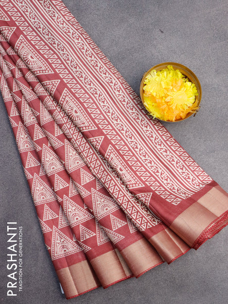 Semi tussar saree maroon with allover geometric prints and zari woven border