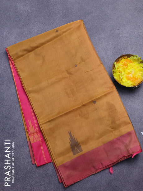 Banana pith saree dark sandal and pink with thread woven buttas and contrast border