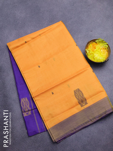 Banana pith saree mango yellow and violet with thread woven buttas and contrast border