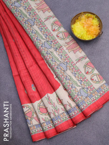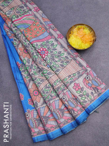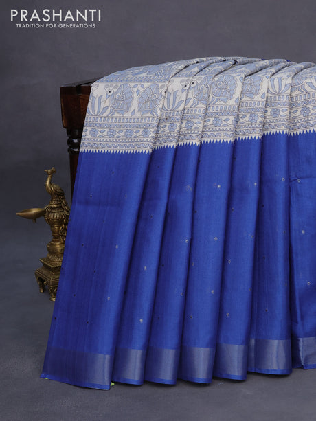 Semi tussar saree off white and blue with madhubani prints & zari buttas and zari woven border