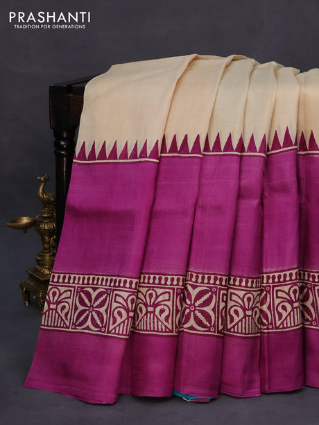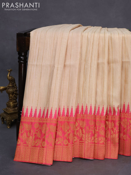 Semi tussar silk saree cream and pink with plain body and long temple design ganga jamuna border