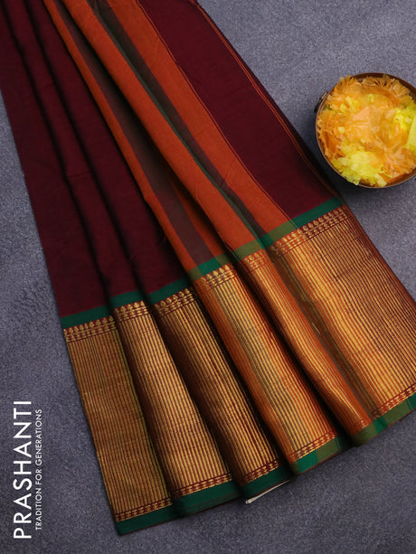 Narayanpet cotton saree maroon and green with plain body and long zari woven border