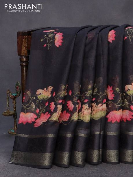 Semi georgette saree black with pichwai prints and rettapet zari woven border