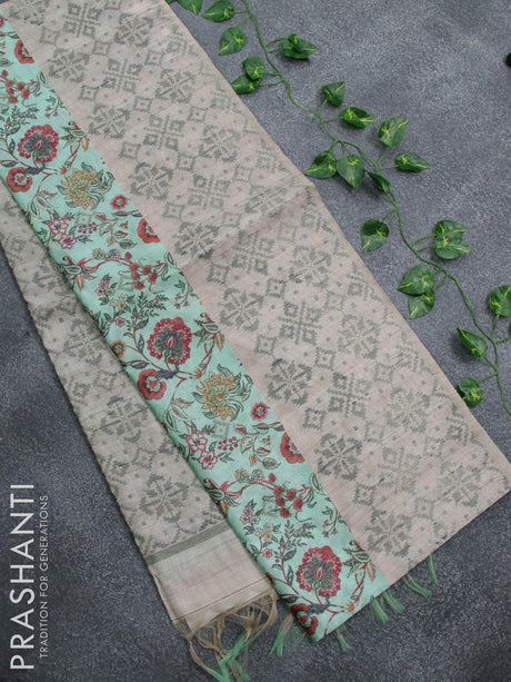 Semi jute silk saree teal blue and beige with allover floral prints woven buttas and woven border