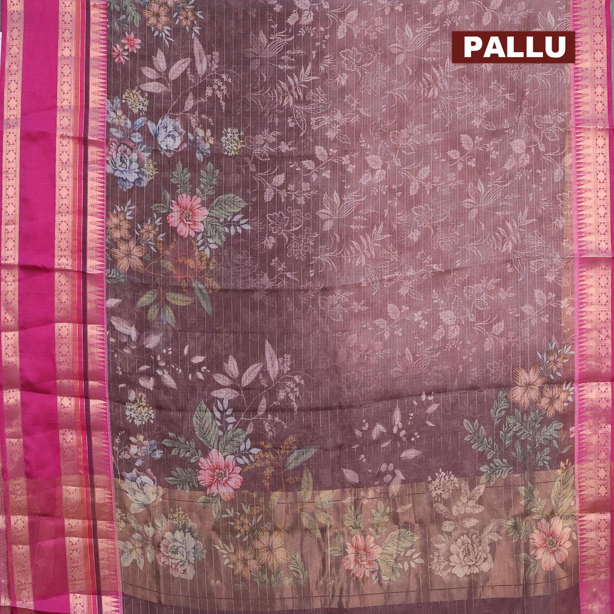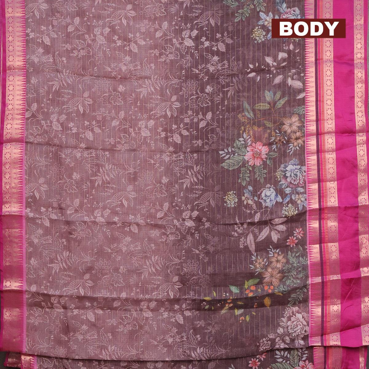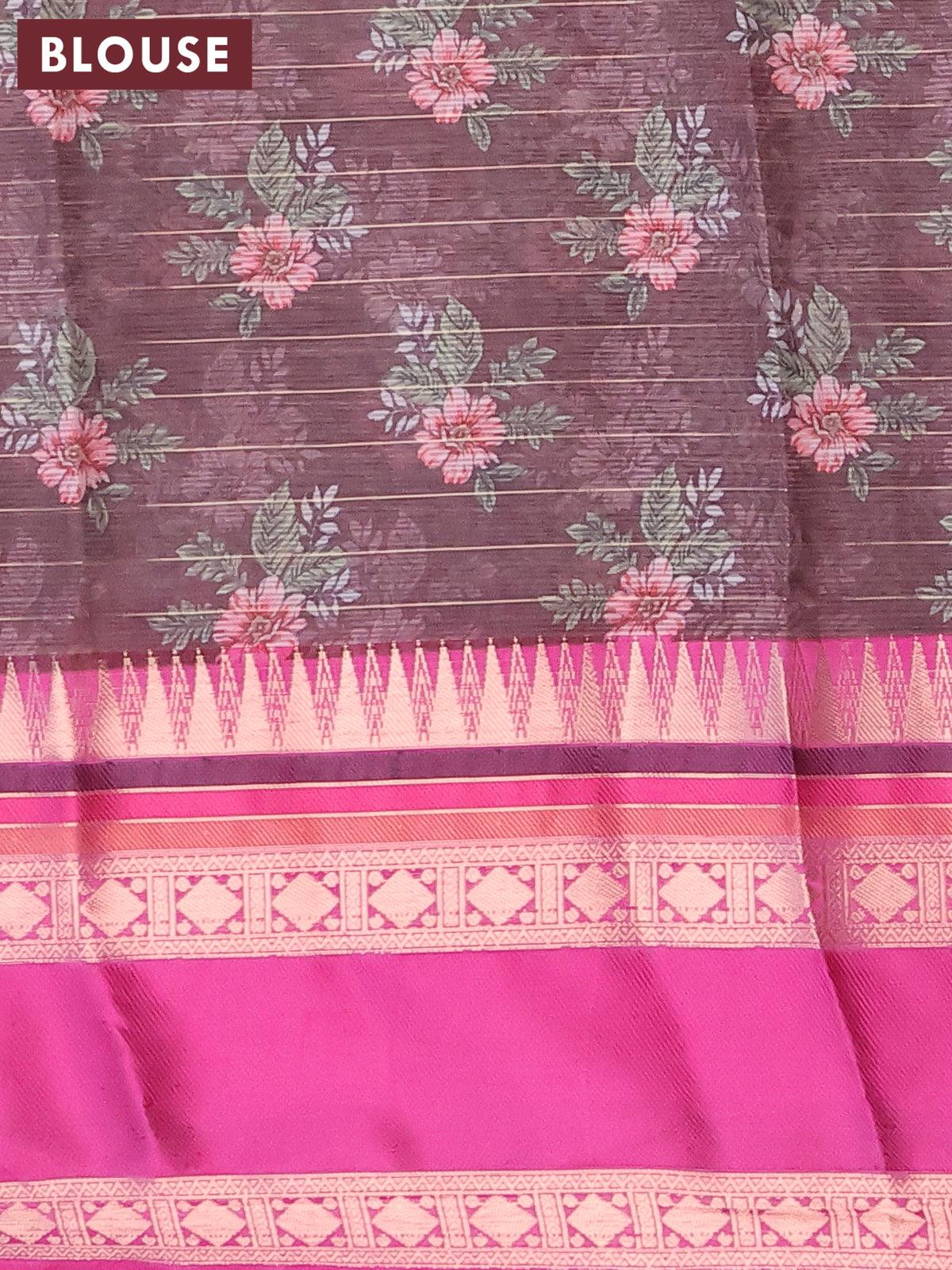 Banarasi kota saree dark brown and purple with allover digital prints & zari stripes pattern and temple design rettapet zari woven border