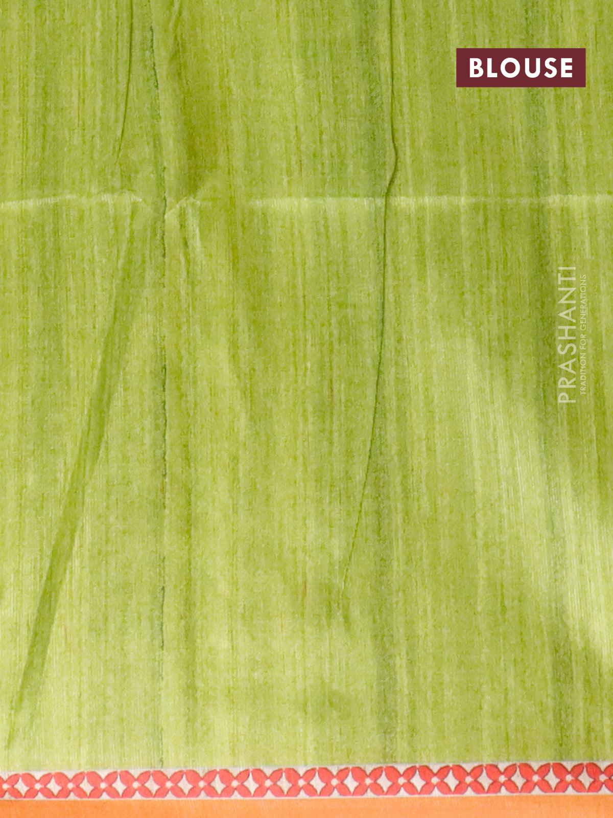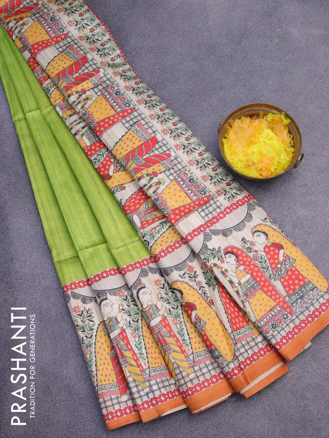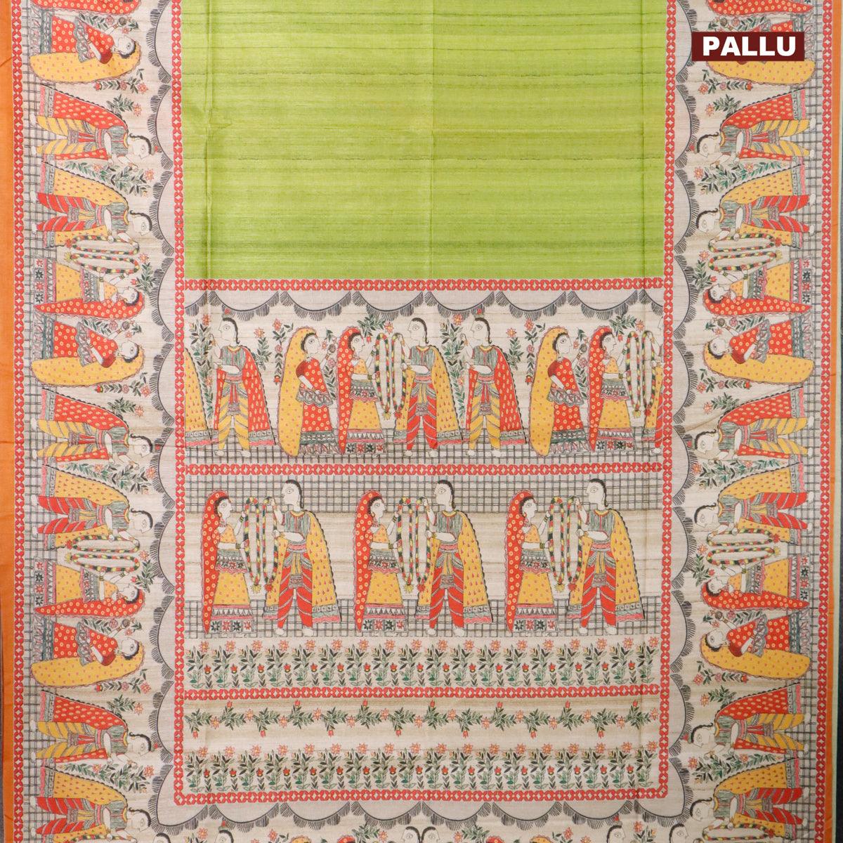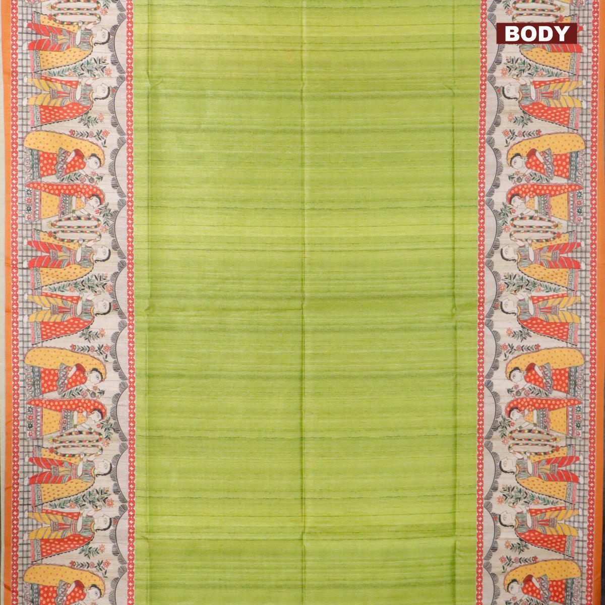 Chappa saree light green and orange with plain body and madhubani printed border is backordered and will ship as soon as it is back in stock.