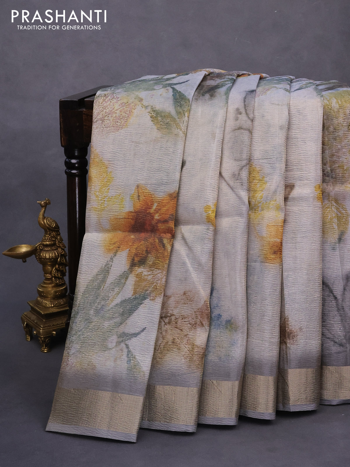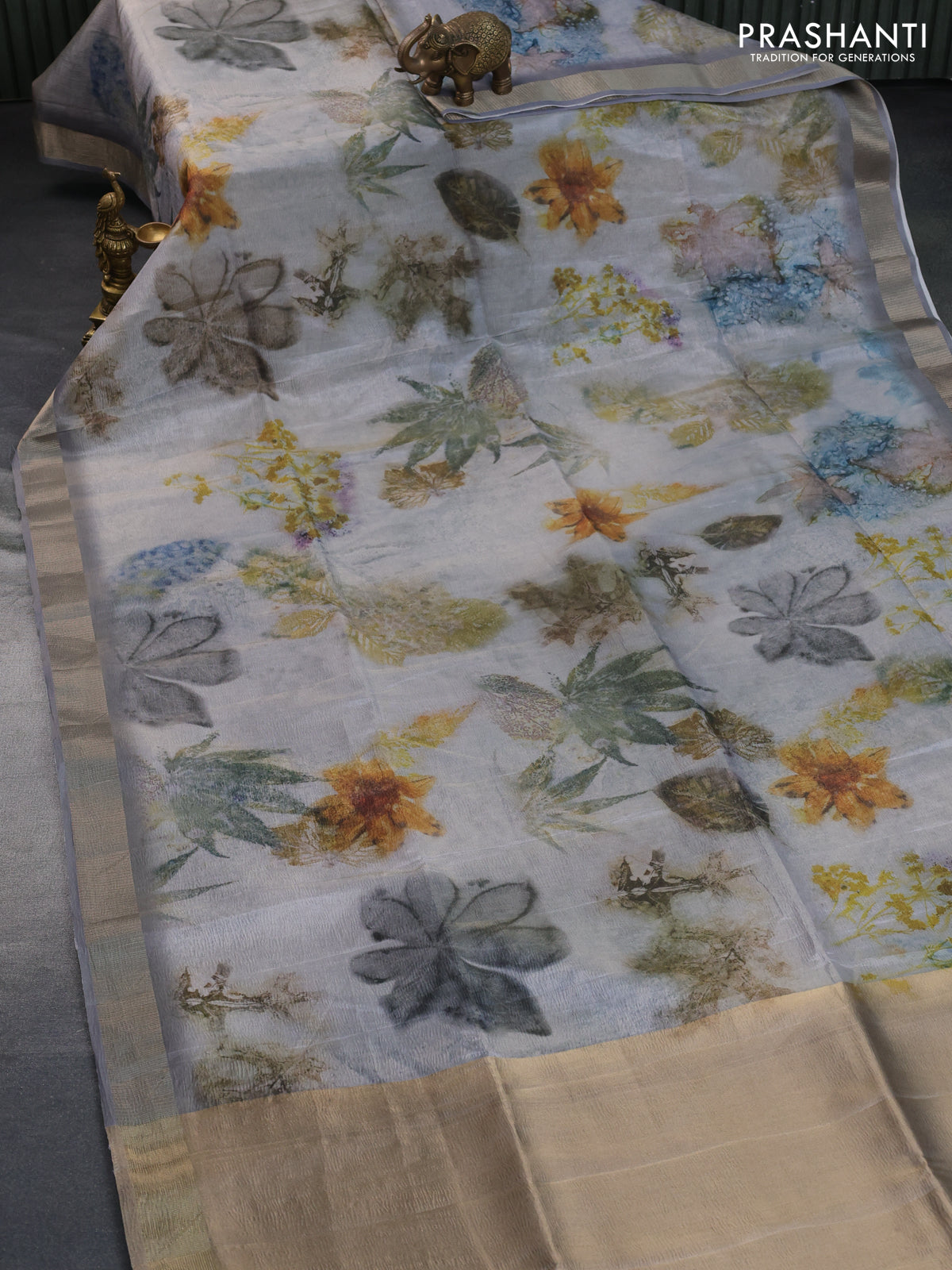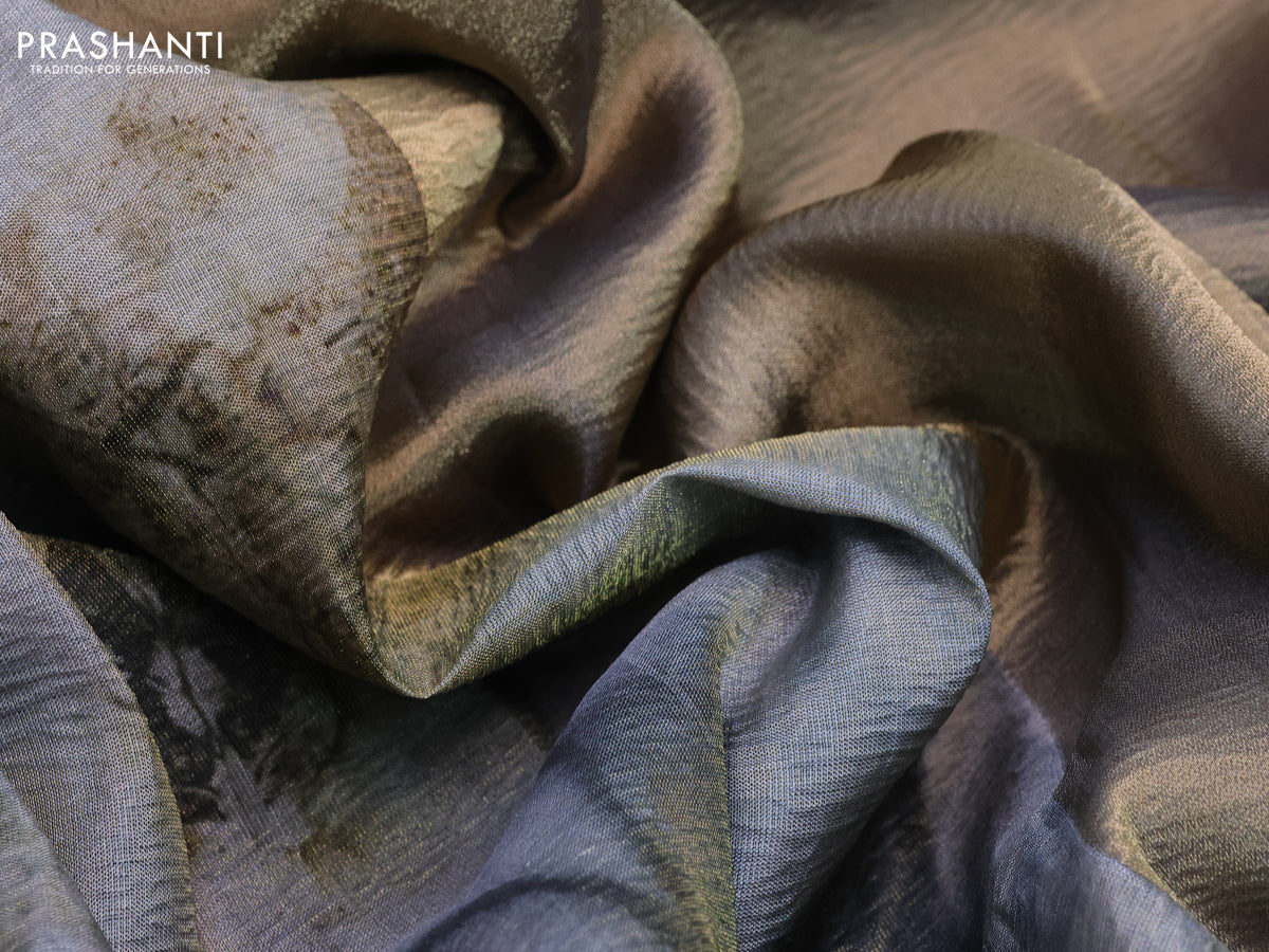 Crushed tissue saree grey with allover digital prints and zari woven border