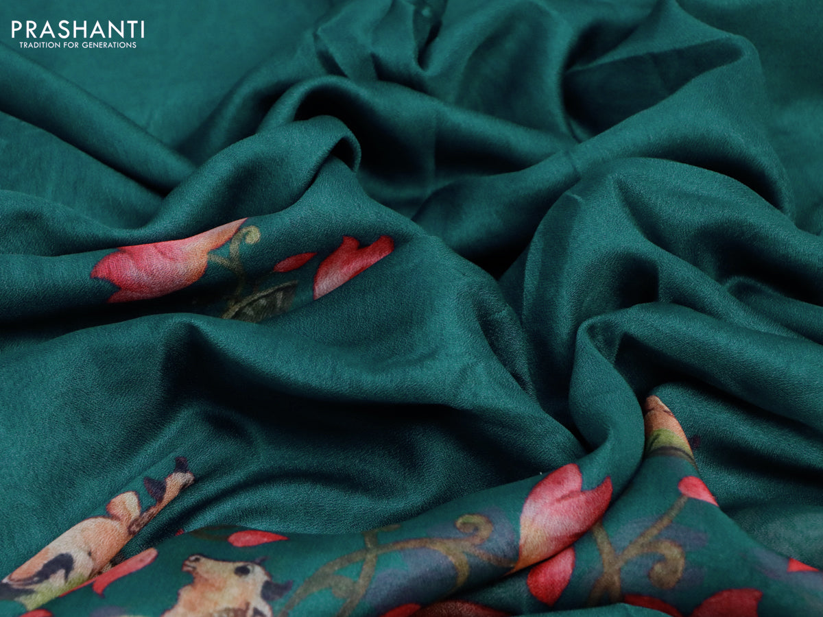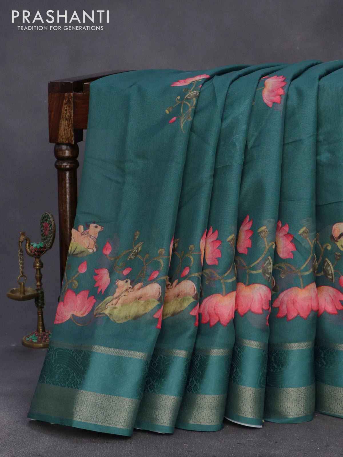 Semi georgette saree peacock green with pichwai prints and rettapet zari woven border