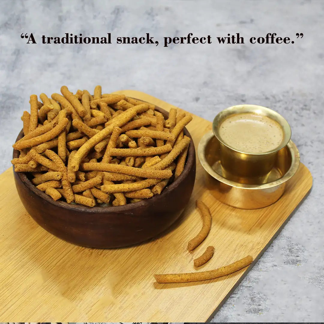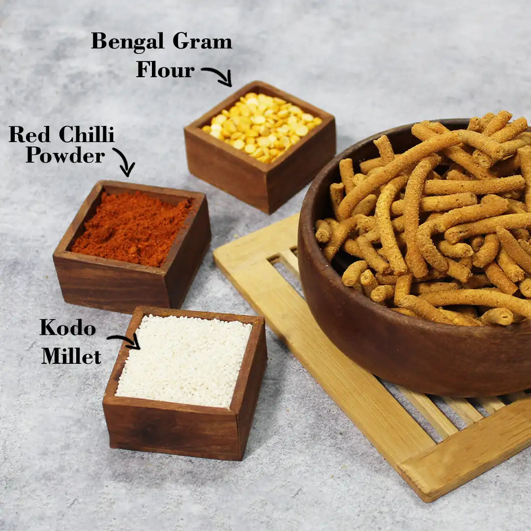 Brought to you exclusively by True Traditions,  Kodo Millet Karasev is a crispy, savory South Indian snack that melts in your mouth with every bite. Handcrafted in India using the finest Bengal Gram Flour, Kodo Millet, Rice Flour, Cumin, and a perfect blend of spices, this traditional delicacy offers a delicious crunch with an authentic flavor that takes you back to the heart of South India.
