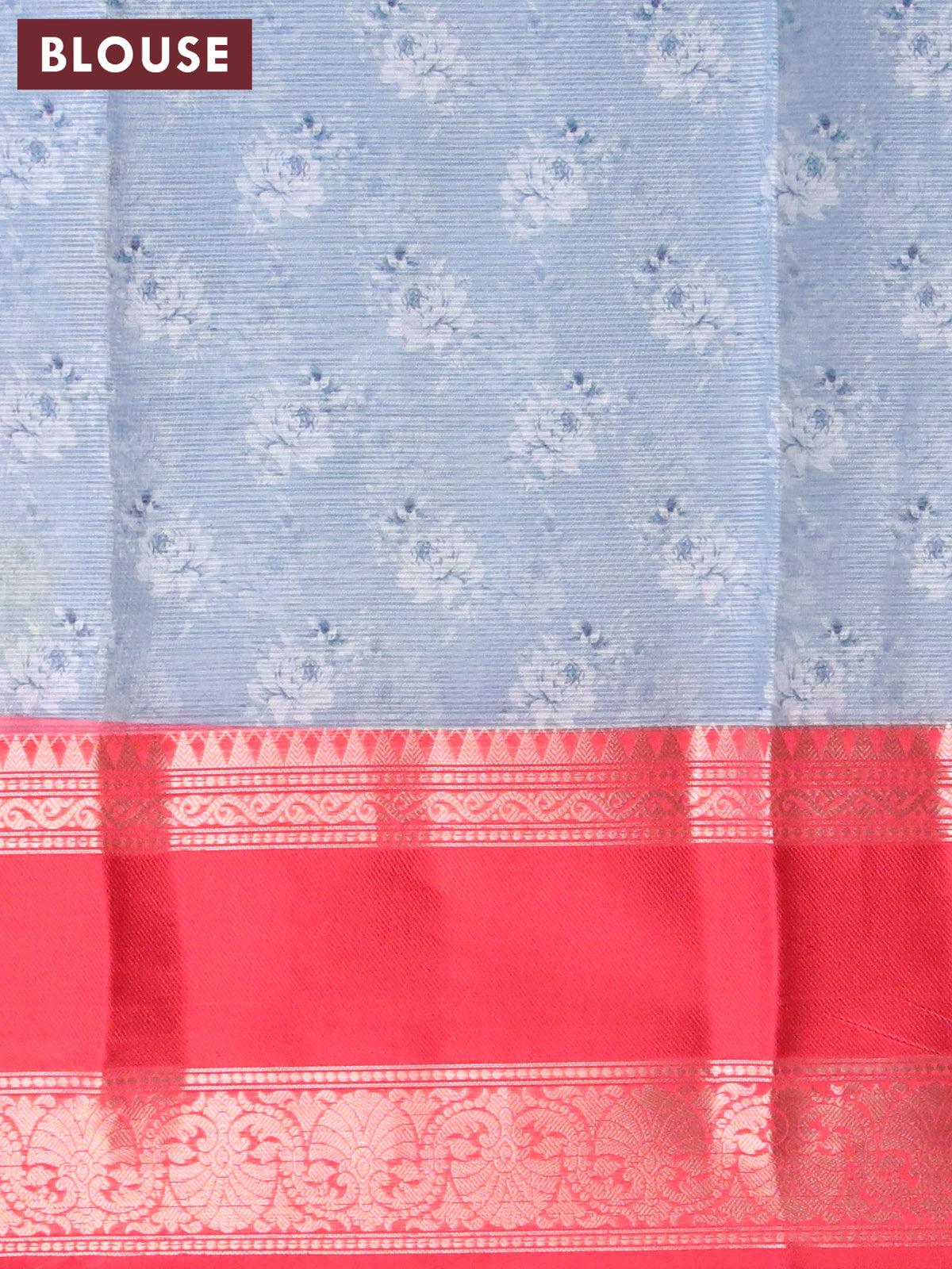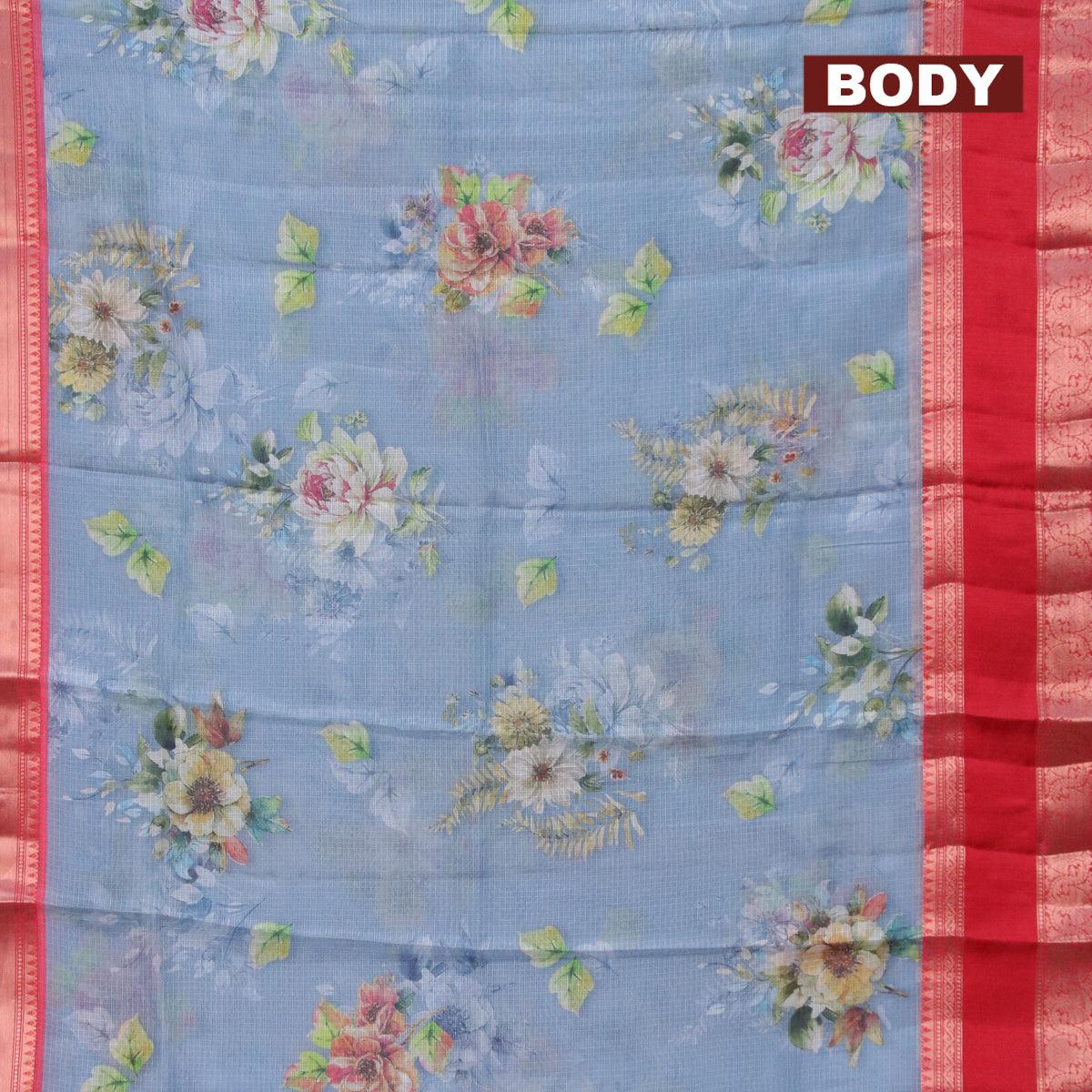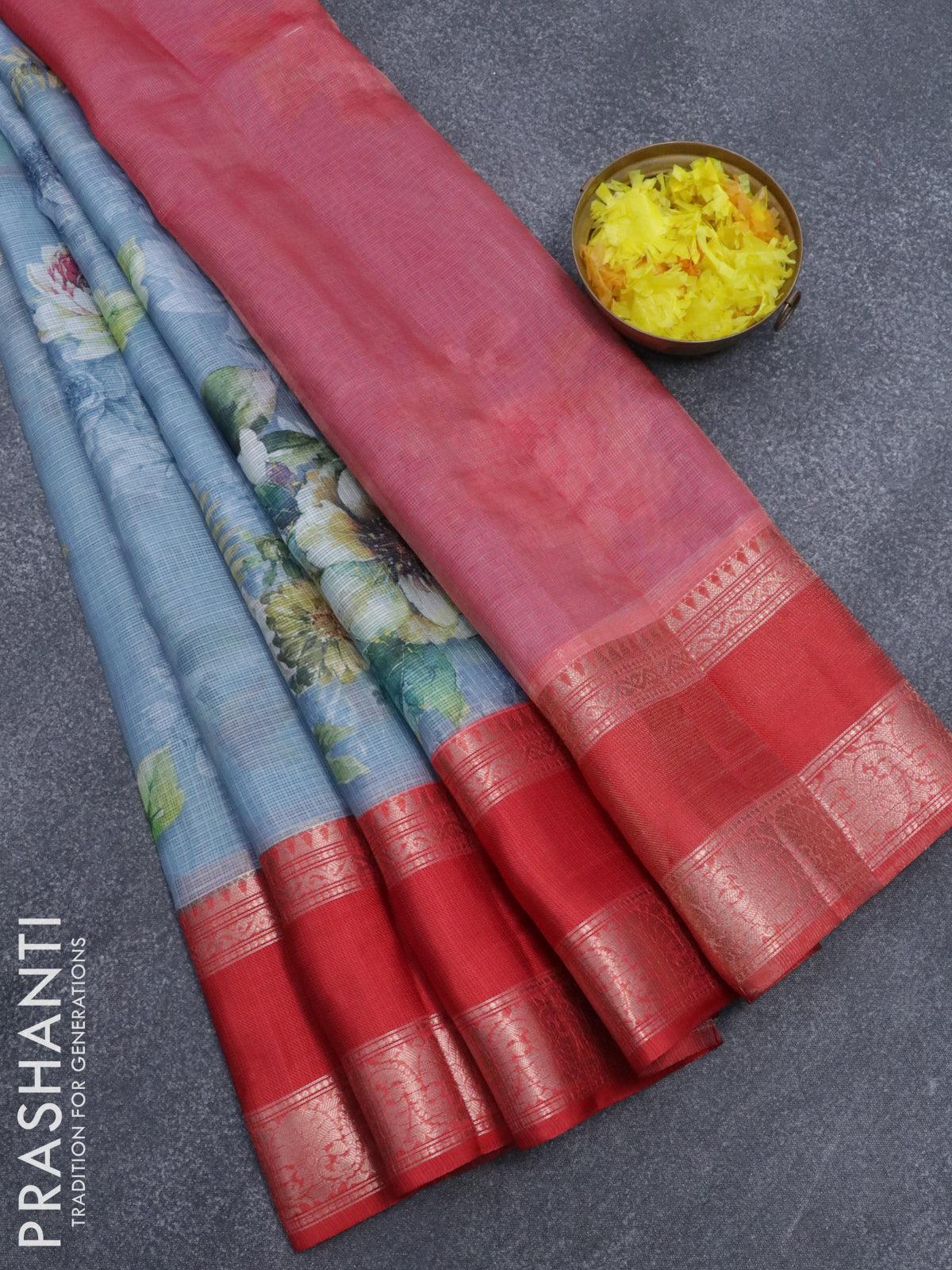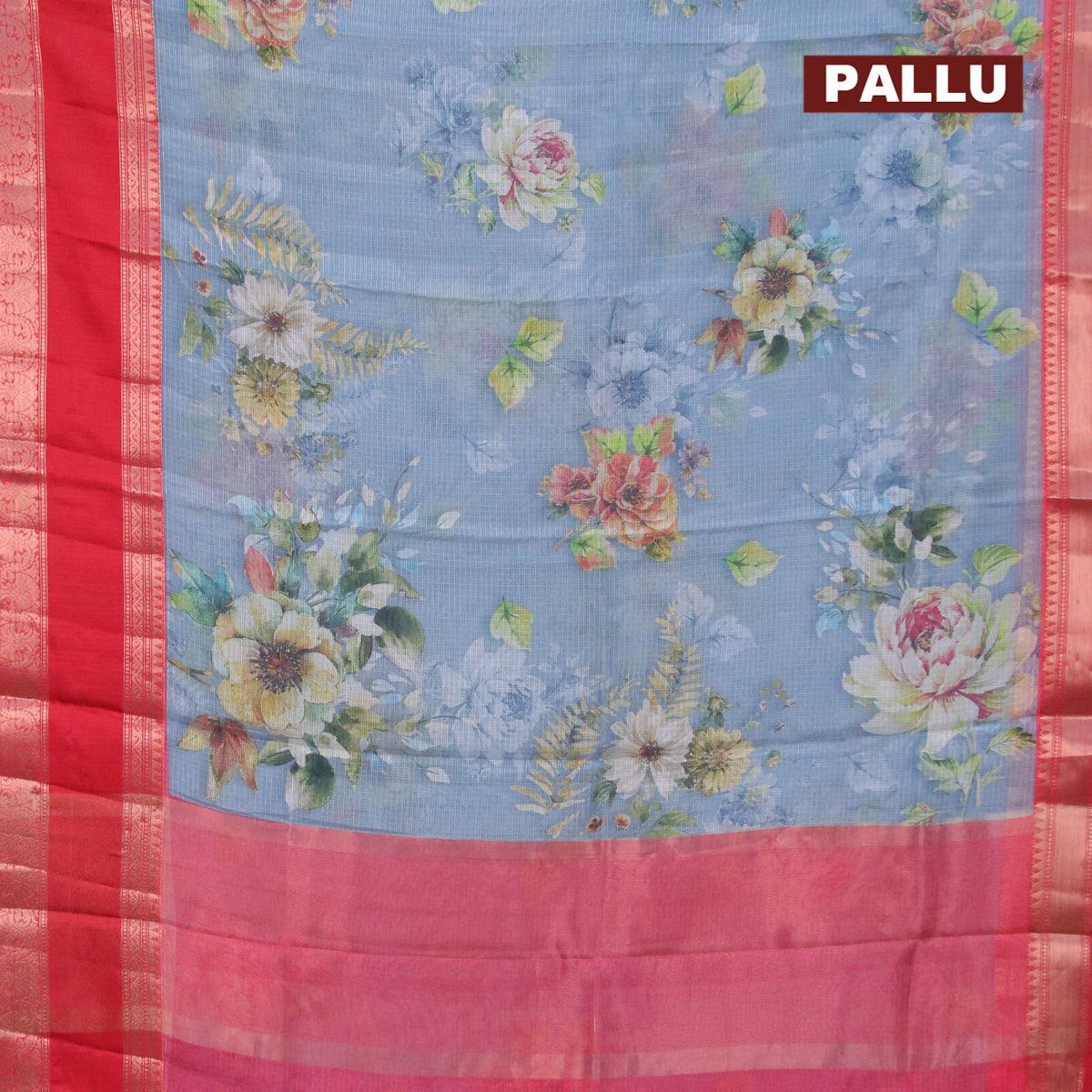 Banarasi kota saree bluish grey and red with floral digital prints and rettapet zari woven border