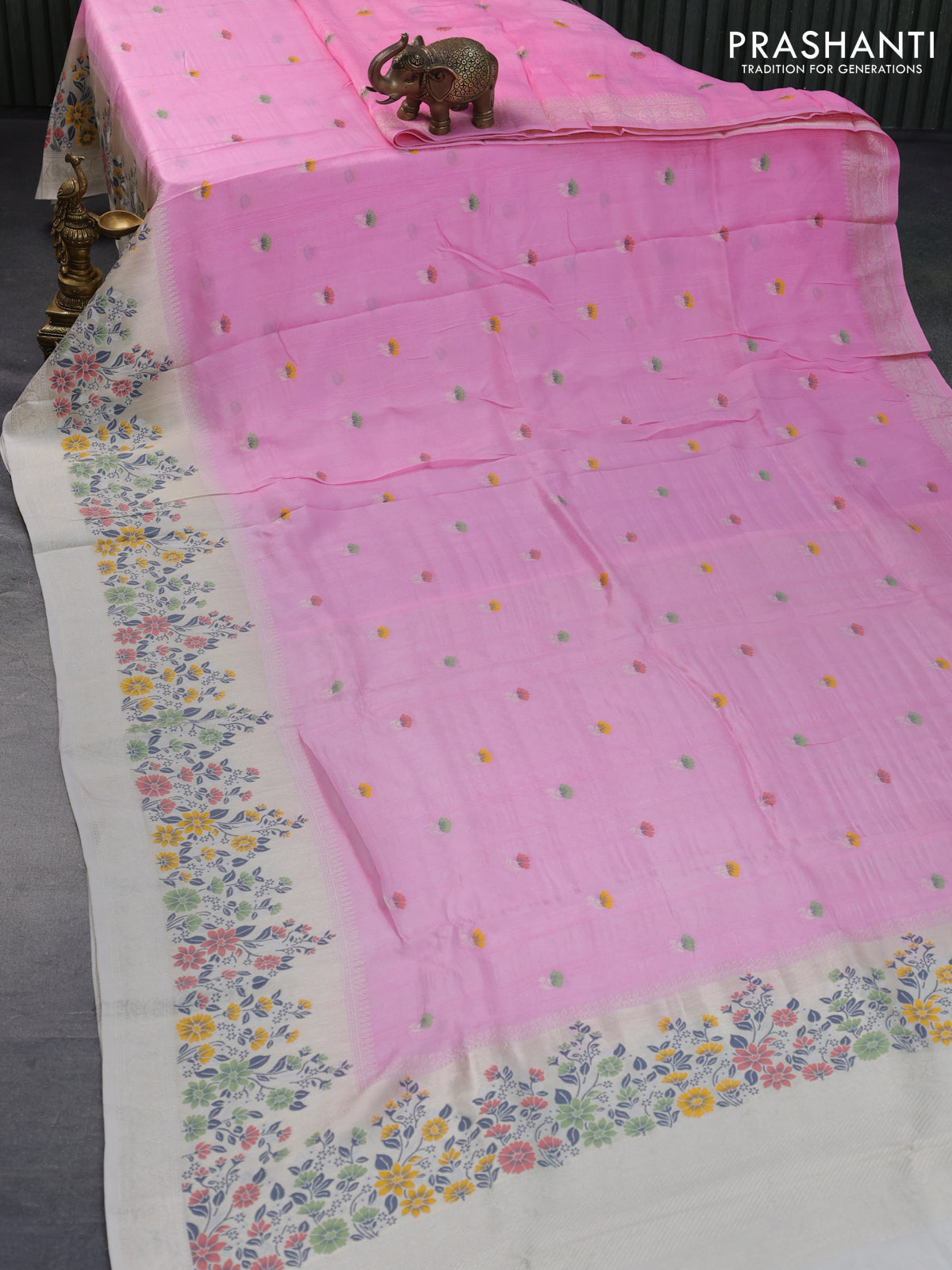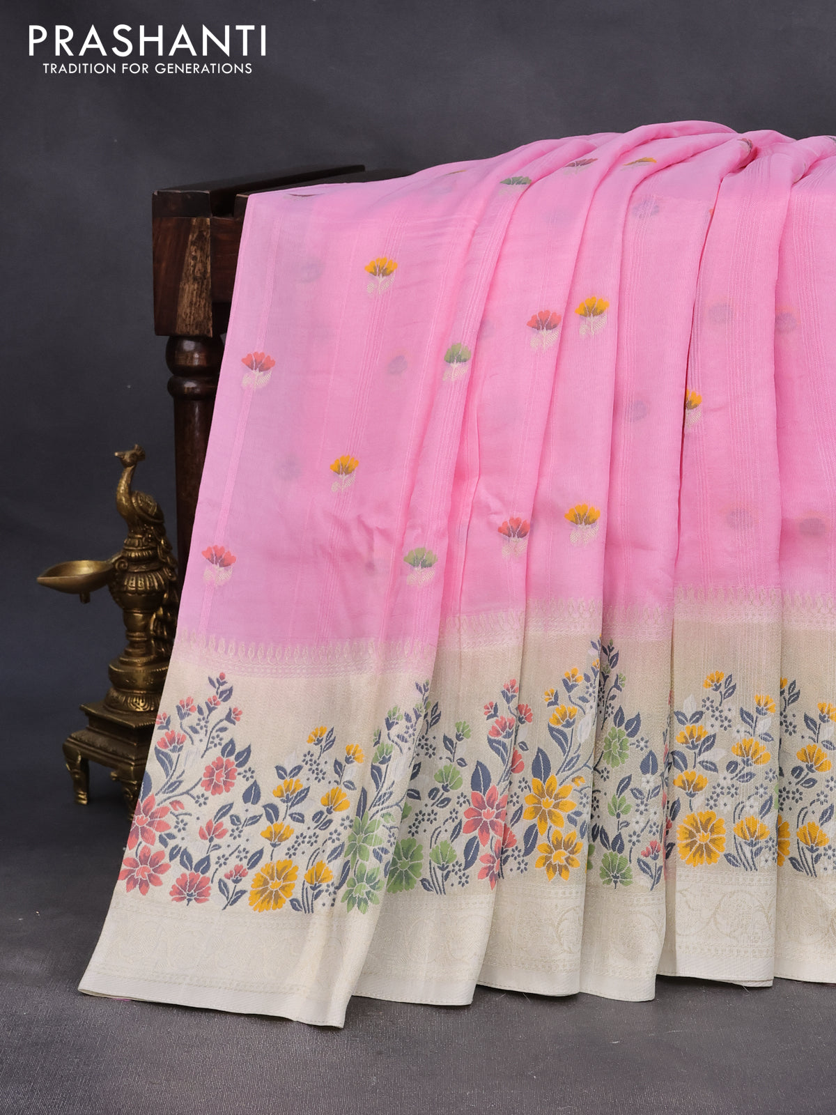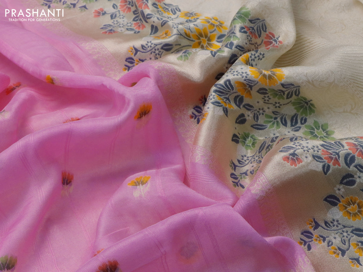 Raw silk saree baby pink and cream with floral prints & zari buttas and zari woven floral paithani border