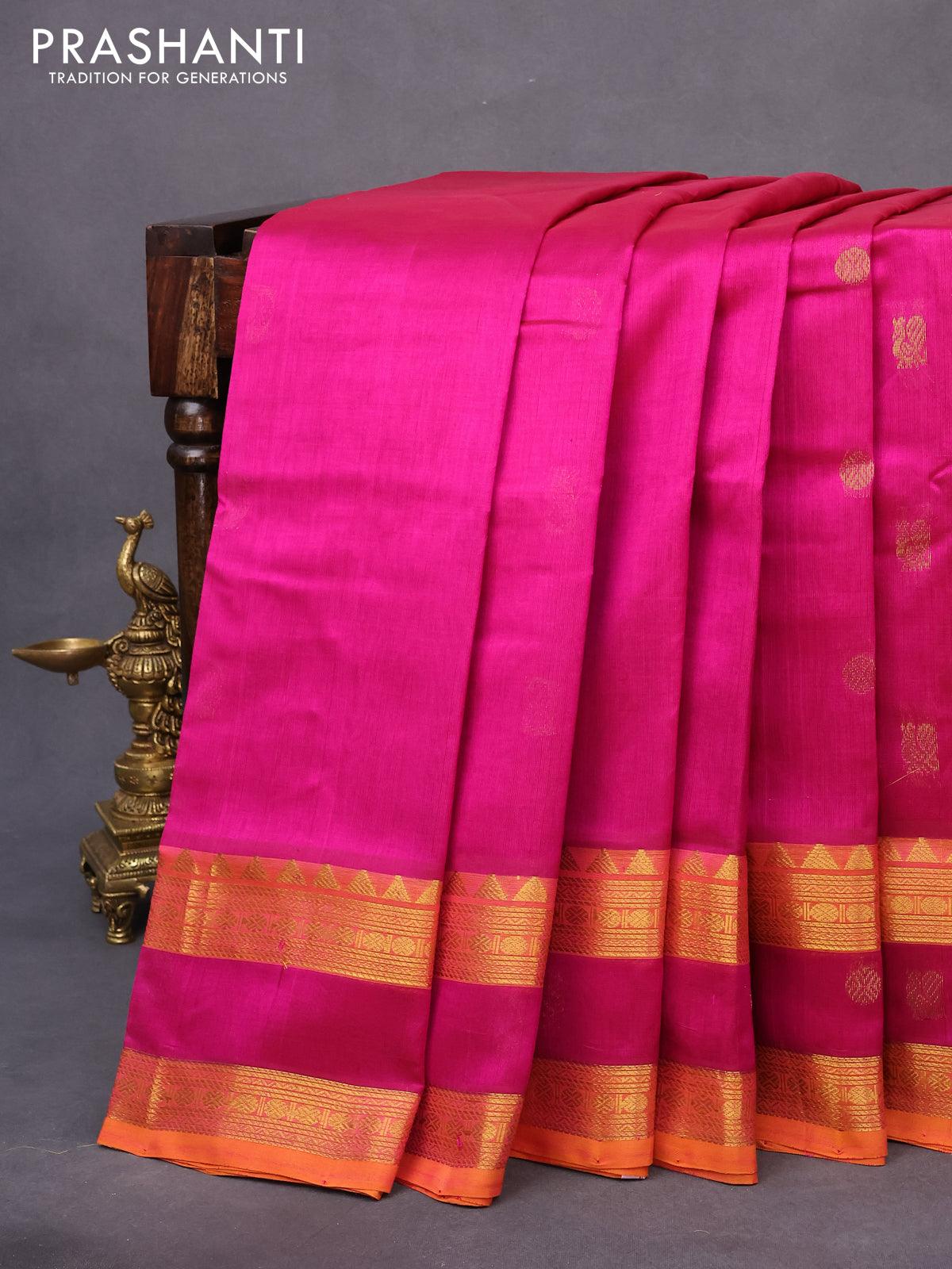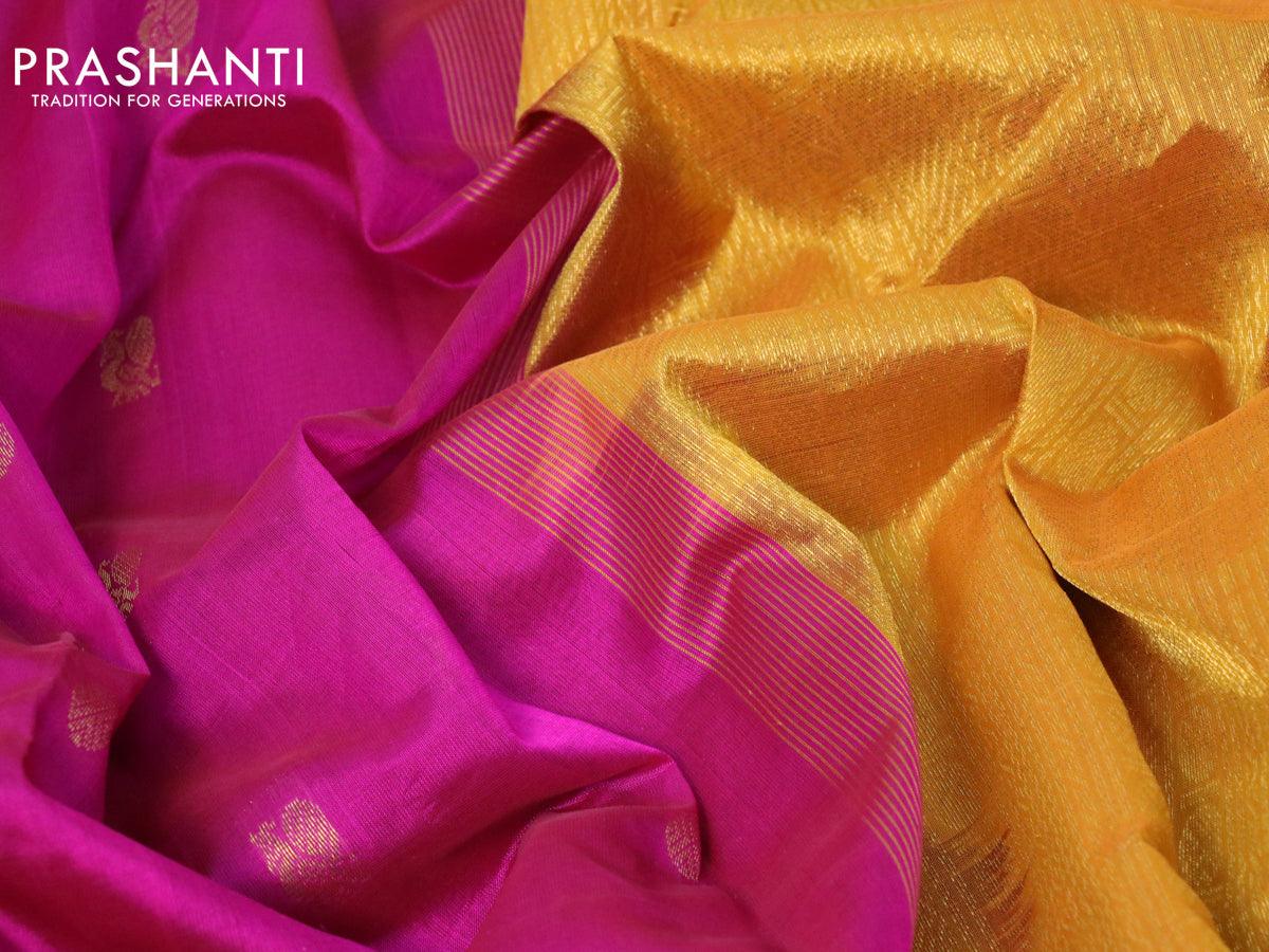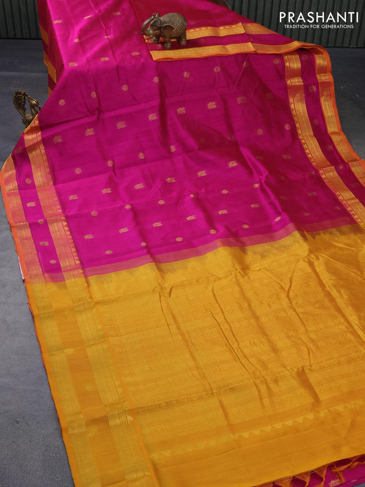 10 yards silk cotton saree magenta pink and mustard yellow with annam & rudhraksha zari woven border and rettapet zari woven border
