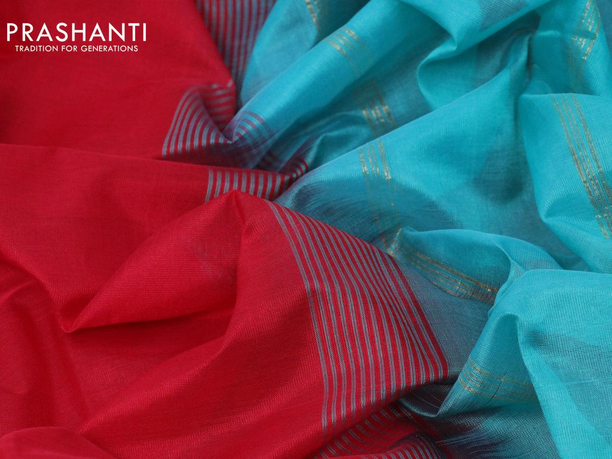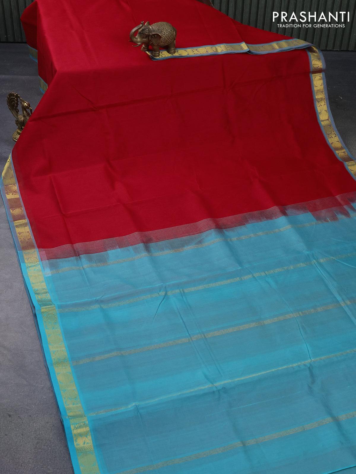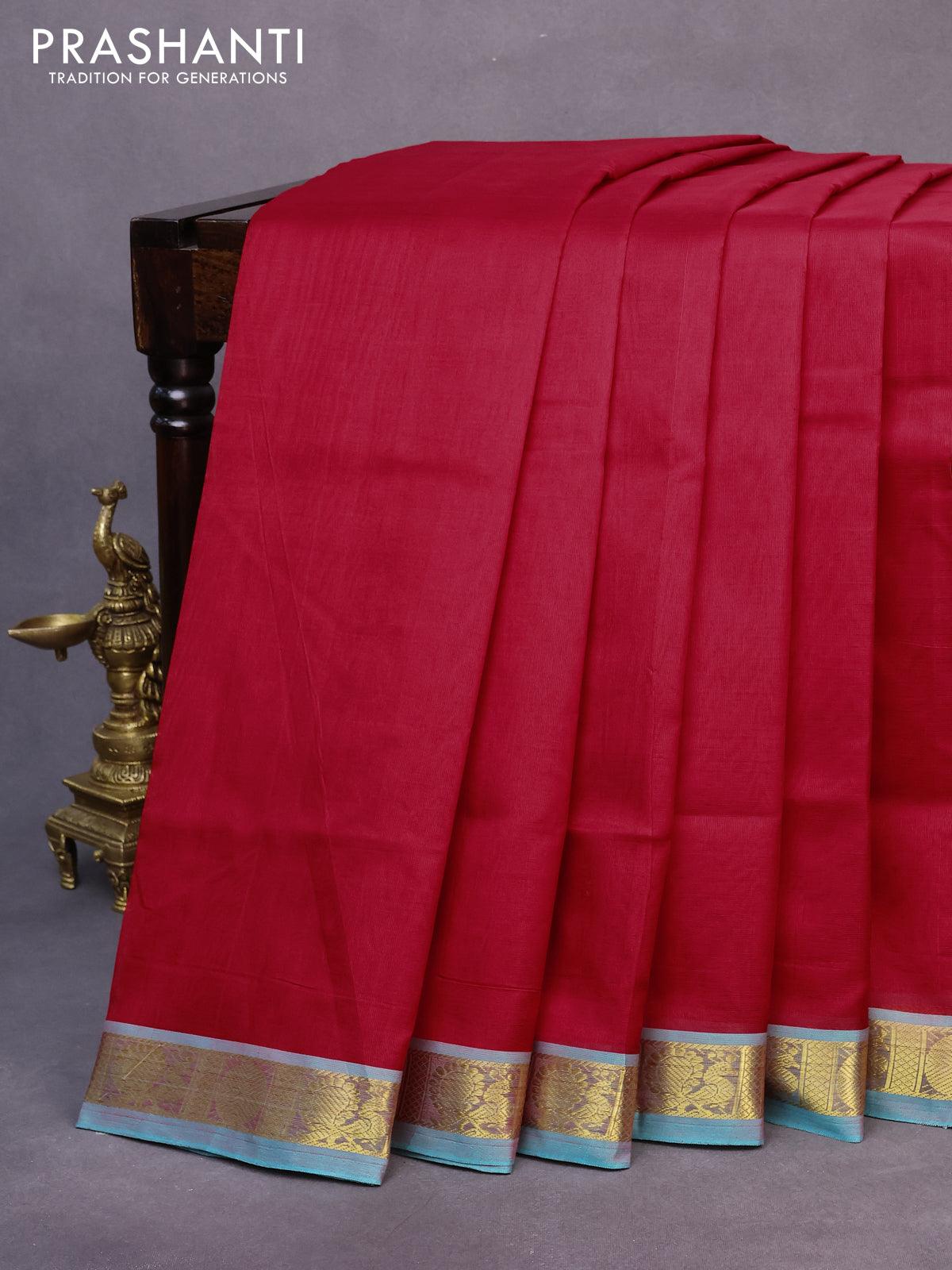 10 yards silk cotton saree red and teal blue with plain body and rudhraksha & annam zari woven border