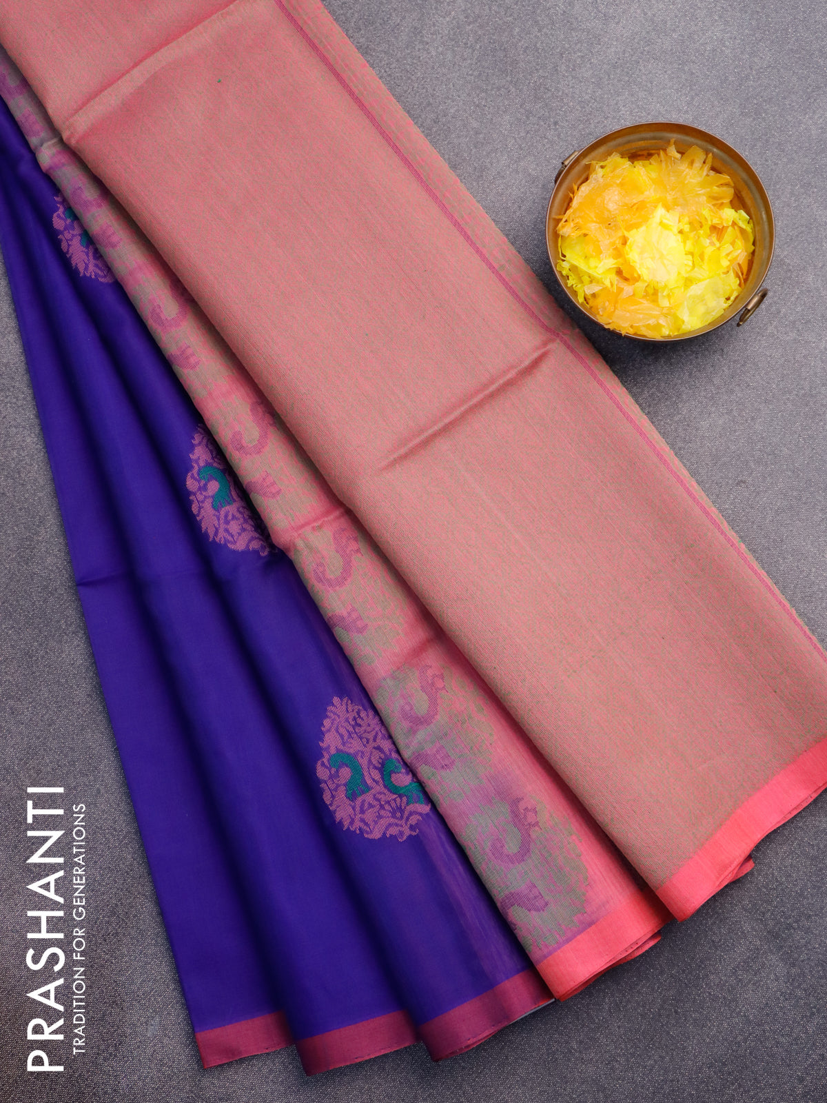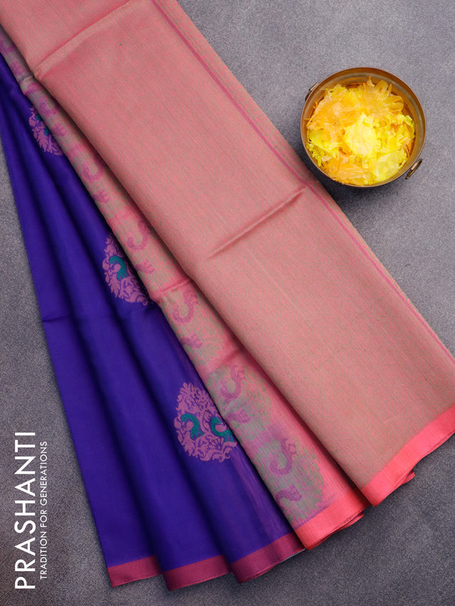 Kora silk cotton saree blue and candy pink with thread woven buttas and simple border