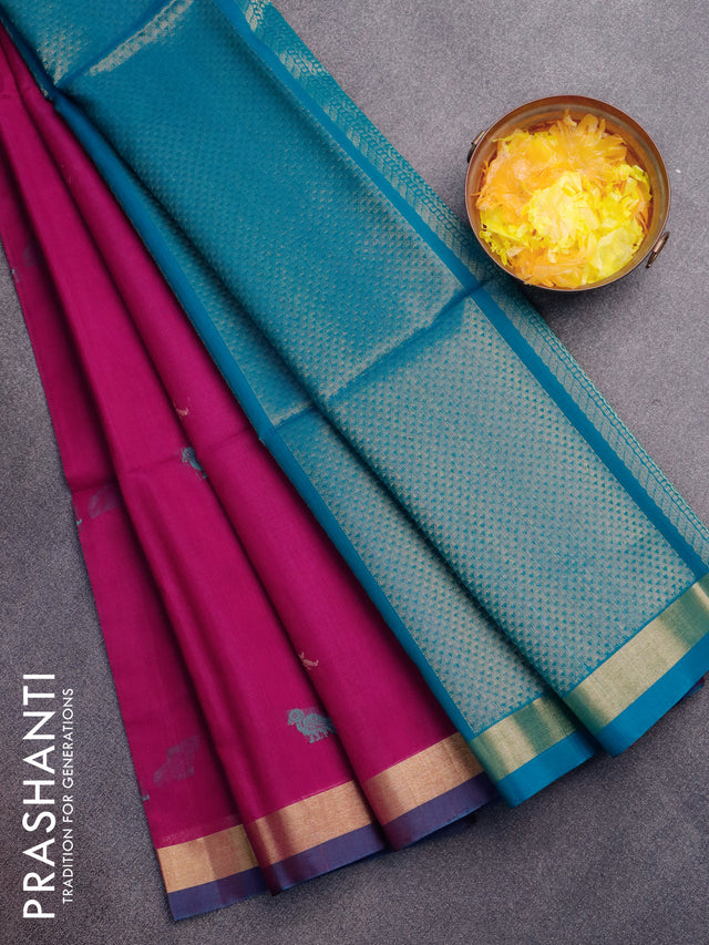 Kora silk cotton saree dark magenta and teal blue with thread & zari woven buttas and zari woven border