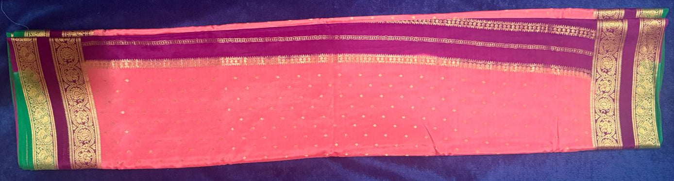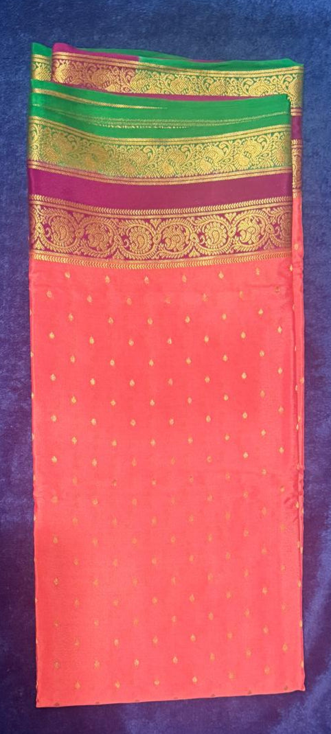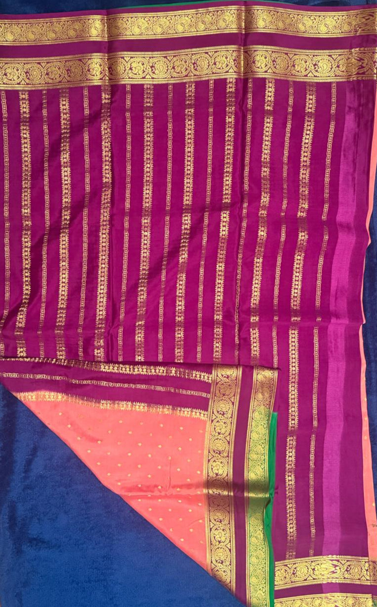 Mysore silk - Aboli Peach with Greeen/Purple is backordered and will ship as soon as it is back in stock.