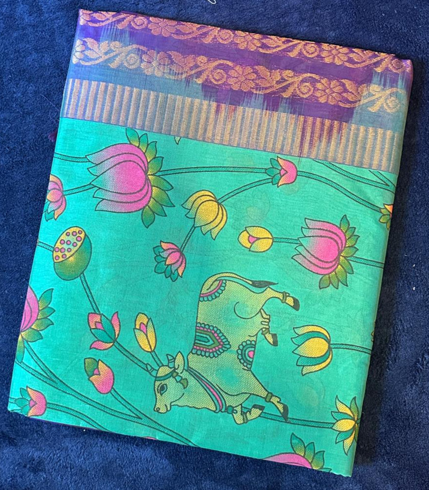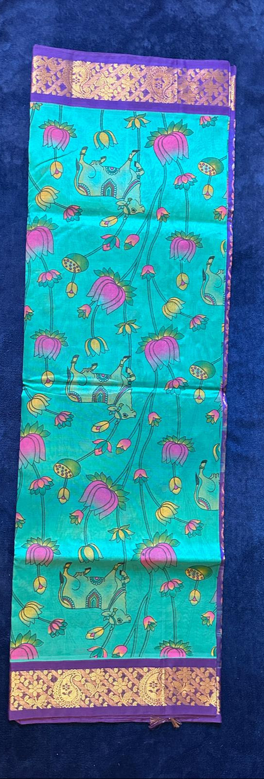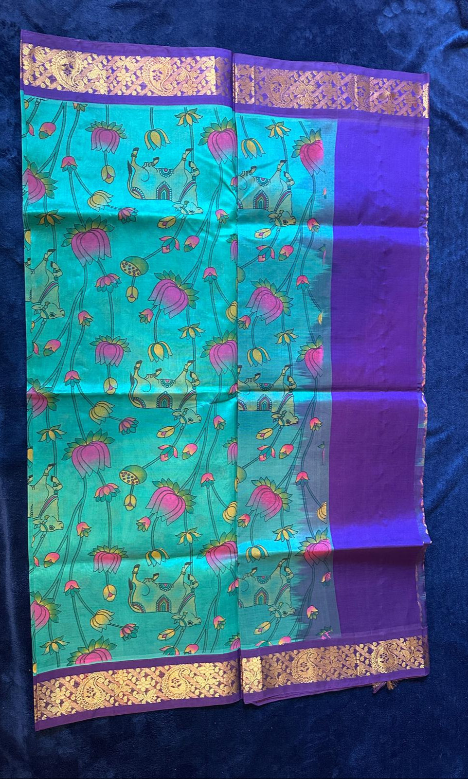Silk Cotton Kalamkari - Aqua Green with Dark Blue