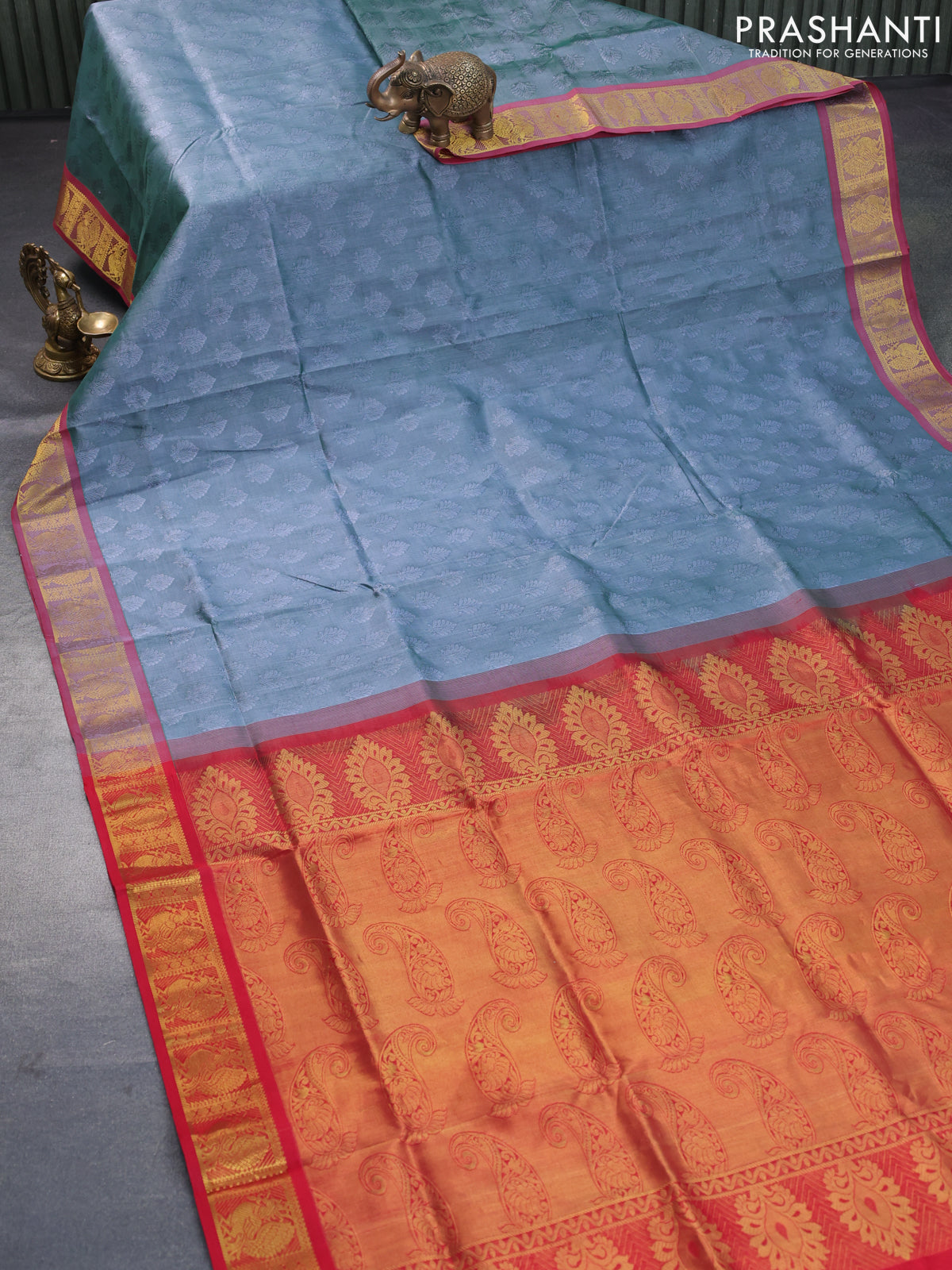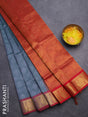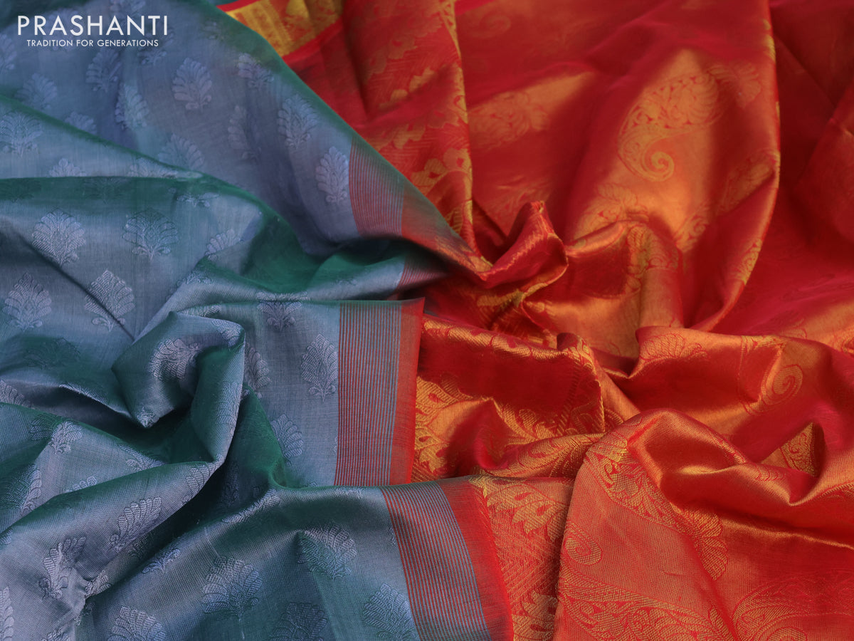 Silk cotton saree dual shade of greish green and red with allover self emboss jacquard and annam zari woven border